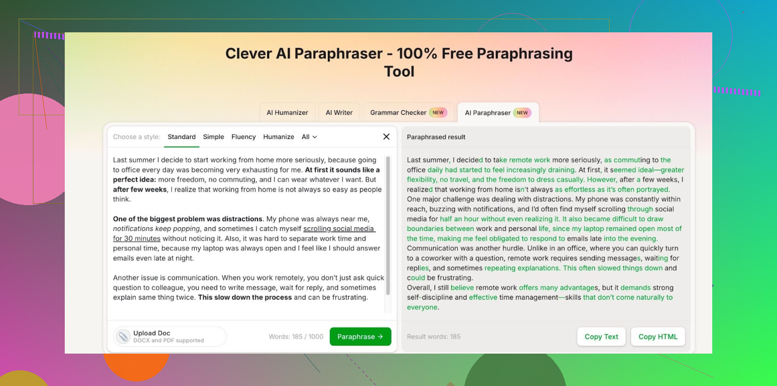 I agree with them on one thing. Clever Ai Humanizer is solid if you want something closer to your own voice. The paraphraser tends to keep sentence length reasonable and does not stuff in odd synonyms every two words.