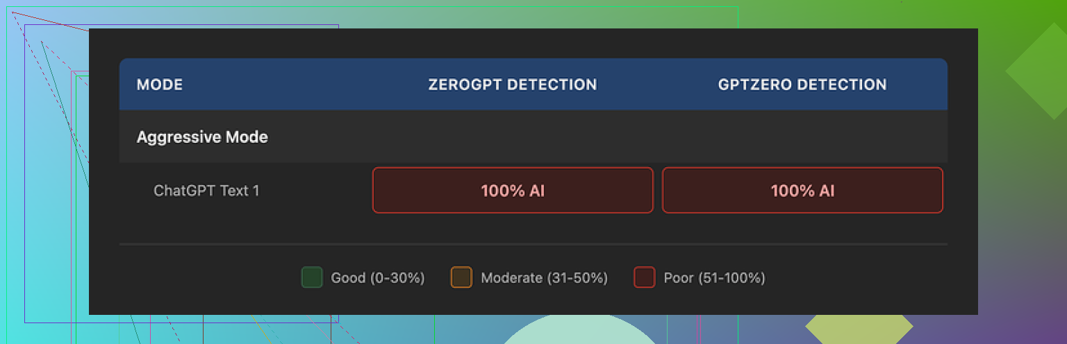 • Originality.ai sometimes dropped from 99 percent to 70–80 percent AI, but never to anything “safe” for strict environments.