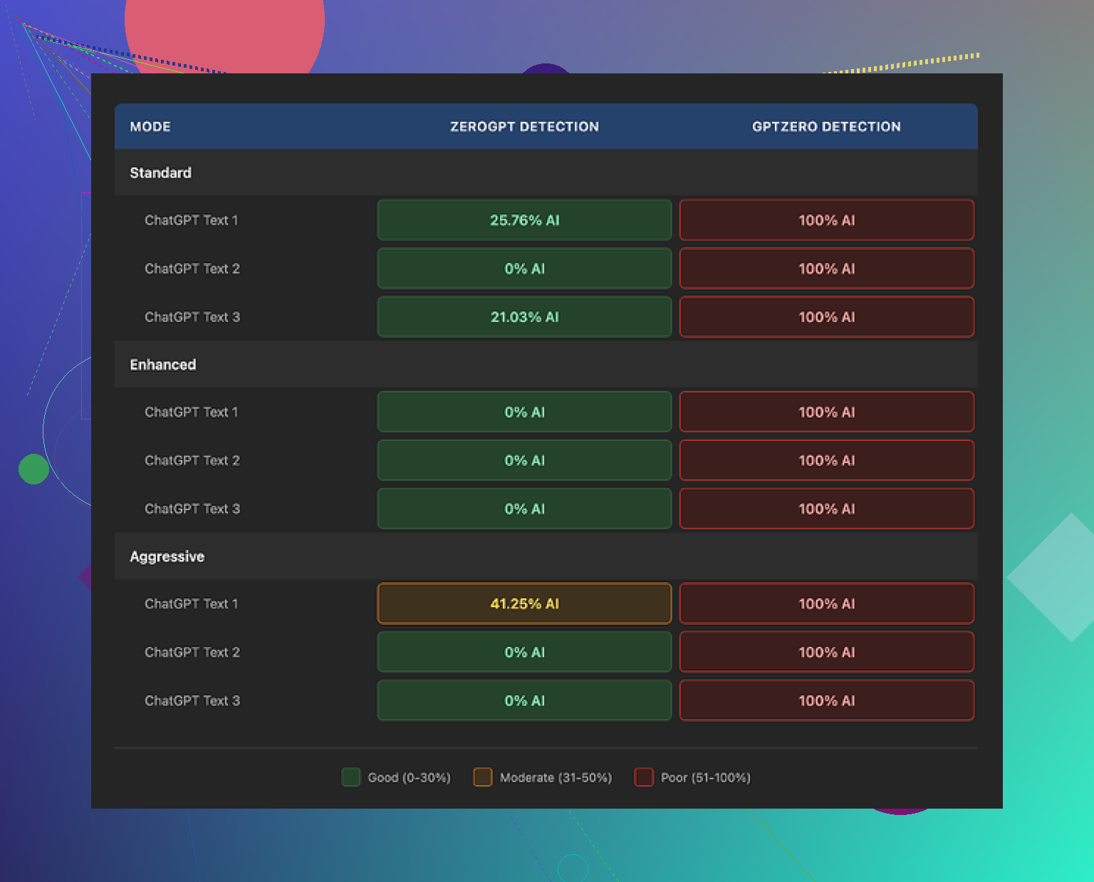 I ran outputs from all three settings, Standard, Enhanced, and Aggressive, through GPTZero. Every single one came back at 100% AI. So if your goal is to get text past detection, this one did nothing for me.